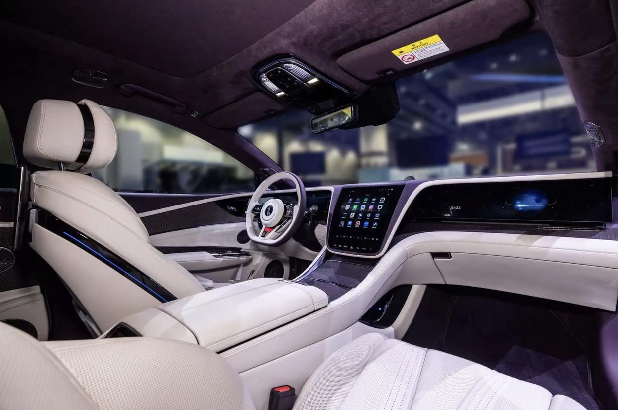 仰望U7的座舱选定了大面积低饱胀度米白色Nappa真皮材质的包裹,银色的金属元素以及亮玄色钢琴烤漆阻拦面板点缀,但凡手能波及到的场地皆选定了高档材质装点,就连车顶和地毯皆选定了植绒面料,但凡手能波及到的区域皆是柔嫩精致的高档质感。车内配备了四个麂皮绒和斜纹软性材质的沙发座椅,加宽加厚的侧翼带来了更好的包裹性和相沿性。中控台选定了经典的T字形布局,配备了经典的三辐式多功能标的盘,两侧银色换挡拨片,还加入了全液晶状貌、中控液晶显露屏、副驾驶多媒体大屏,还有随地可见的汉字标注,让东谈主嗅觉愈加亲切。