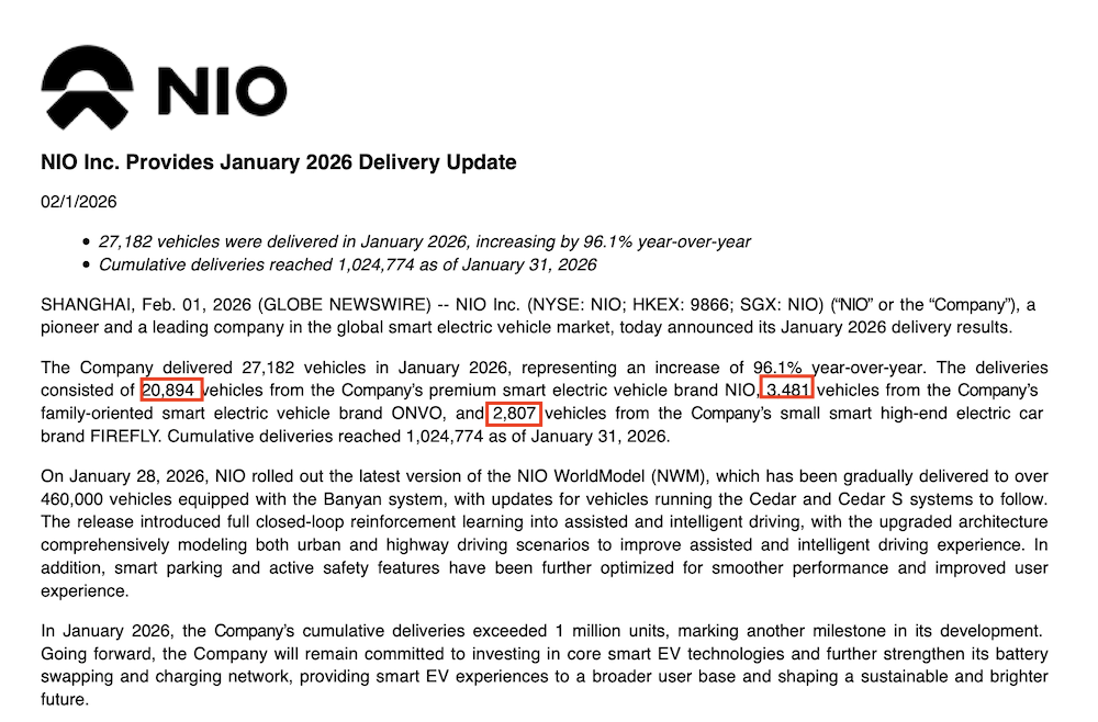▲蔚来集团2026年1月销量