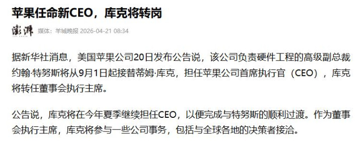 苹果官宣,现任CEO库克将于9月1日卸任,转任董事会践诺主席,接替他的是硬件工程高档副总裁约翰·特努斯。
