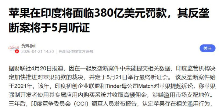 险些同期,印度竞争委员会(CCI)传出音讯,将对苹果处以380亿好意思元天价反把持罚金,这一金额创下苹果历史最高罚单记录,也成为印度反把持史上最大一笔贬责。