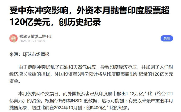 2026年以来,外资对印度营商环境的不信任集合爆发,为止3月底,异邦机构投资者在印度股市净卖出额高达121亿好意思元,创下历史单月最高记录。