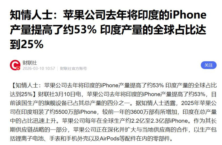 财联社3月报谈,昨年苹果在印度拼装了约5500万部iPhone,较前一年增长53%,占全球产能的近四分之一。