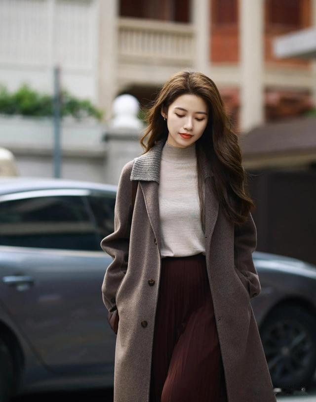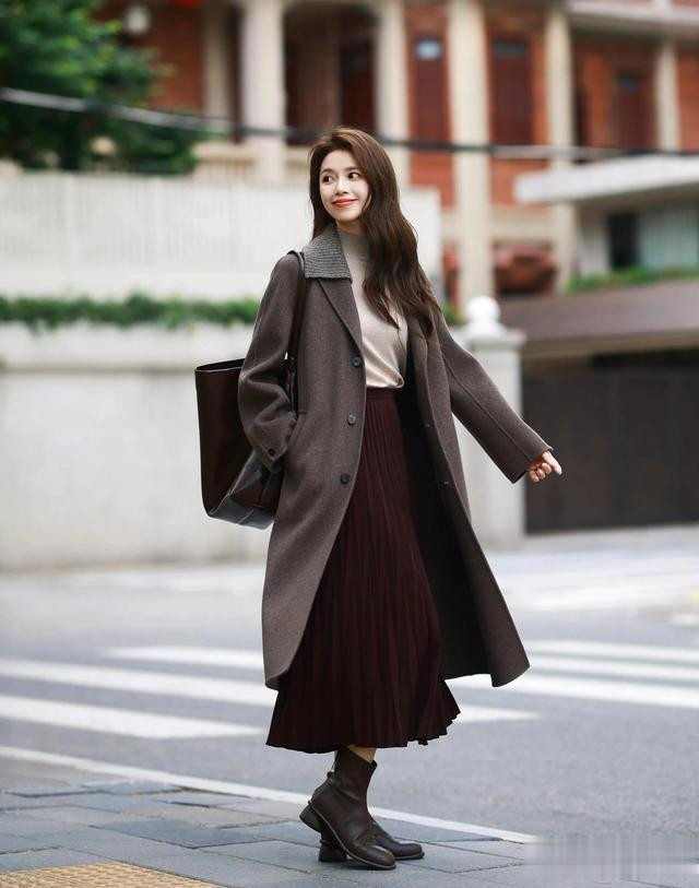 回顾来说,“棕色大衣+车厘子红半身裙”这个搭配,既顺应现时先锋的“温暖、地面色系成为主调”的流行主义,又能传递出节日中温婉优雅、千里稳大气的气质。