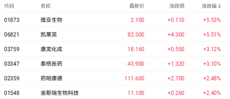 财联社3月5日讯(裁剪胡家荣)本日港股医药板块发扬活跃。适度发稿,维亚生物(01873.HK)5.53%、凯莱英(06821.HK)涨5.51%、康龙化成(03759.HK)涨3.10%、泰格医药(03347.HK)涨3.10%。