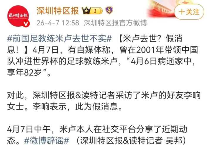 据@深圳特区报报说念,记者采访了米卢的好友李响女士。李响暗示,此为假音信。