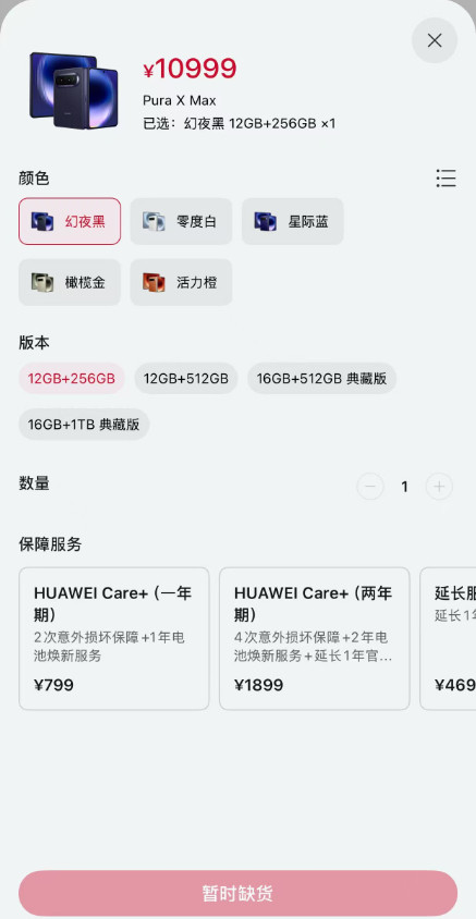 据华为商城流露,华为PuraXMax开售即售罄,各个版块均已断货。