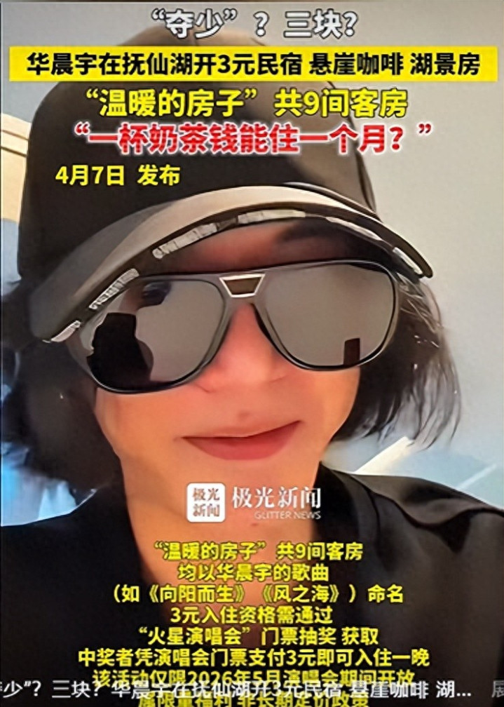 4月7日,华晨宇在直播中自曝,将在云南玉溪的抚仙湖开民宿,名为“仁爱的屋子”,共9间客房,一齐用歌曲定名,开云app在线体育官网买演唱会门票即可抽奖,抽中只需3元就能入住。
