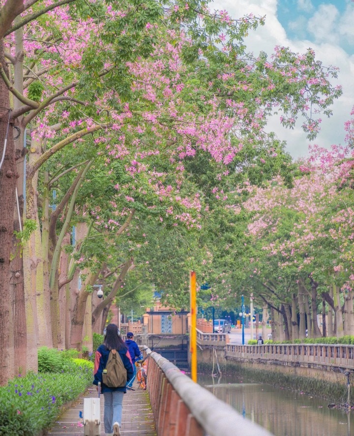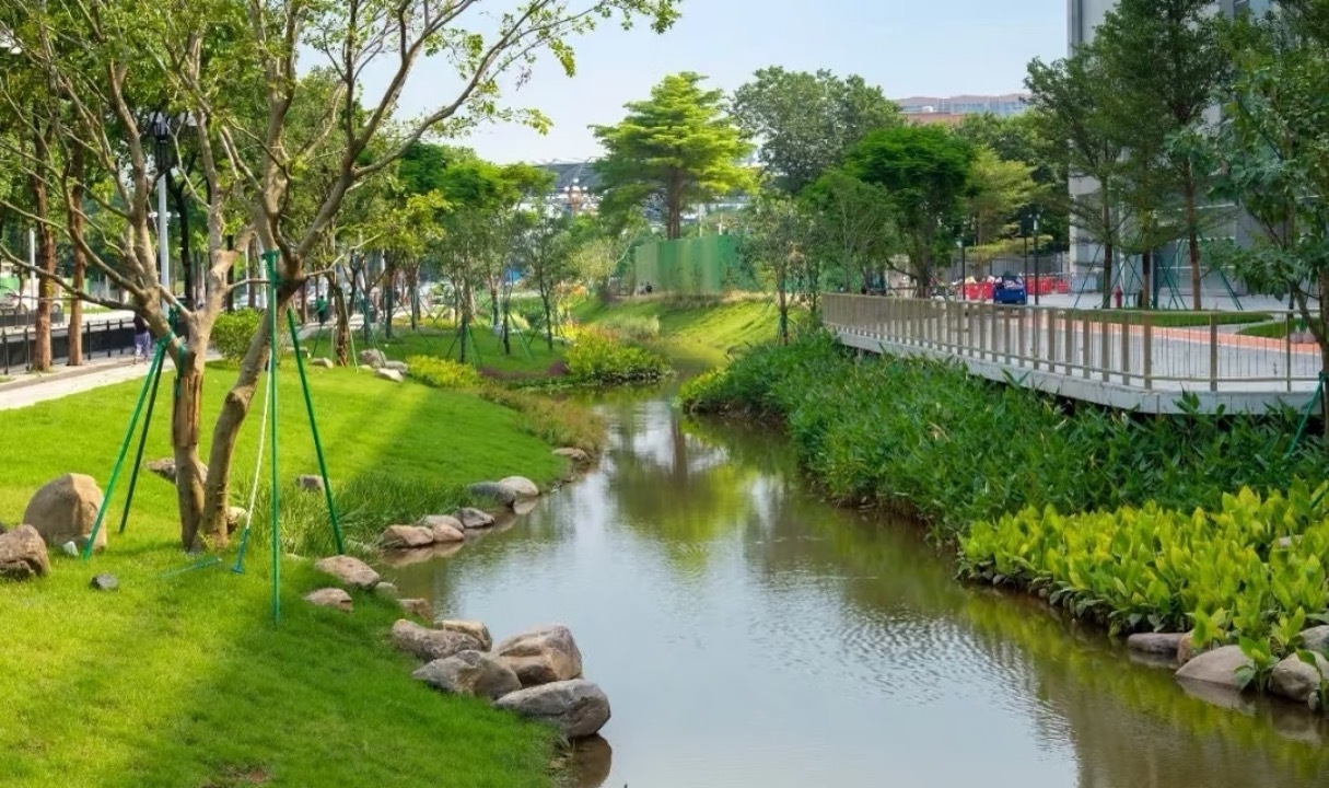 效率中轴线景不雅提高。针对沙坦涌中轴线区域,构建“一廊四景”(叠浪花境、活力阳台、海绵花圃、康养花圃)的活力空间系统。一齐造就了花叶好意思东谈主蕉、长春花等22种不雅赏性花草,以及8种乔木与2种灌木,酿成脉络分明、四季有景的生态空间。三是城市微更新与“光亮工程”。