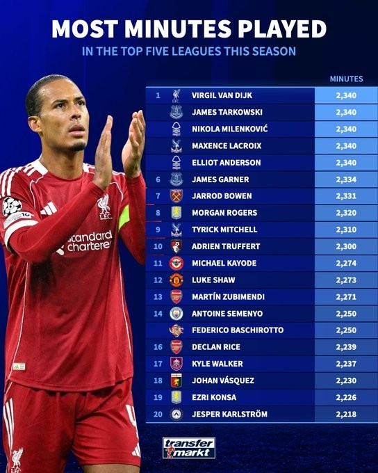 亚博体育 五大联赛出场技巧排名:范戴克、安德森等东谈主以2340分钟并排第一