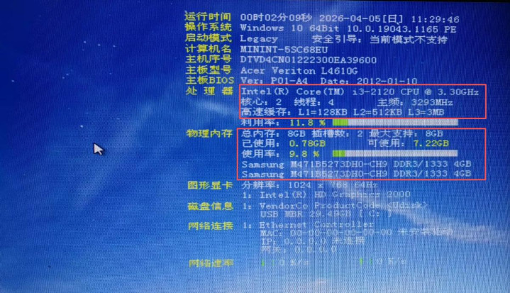 看外形这台主机应该是宏碁的L480机型,料理器是i3 2120,双核四线程,主频3.3GHz。当今这颗U二手也就值个10块。但它带了8GB的DDR3内存,虽说是两条4G组合,但买这两个根,二手鱼上差未几60到70元。另外还给了一个原装电源,接口相沿VGA和DVI。卖家说之前跑NAS用的,成色泛泛,功能都好。