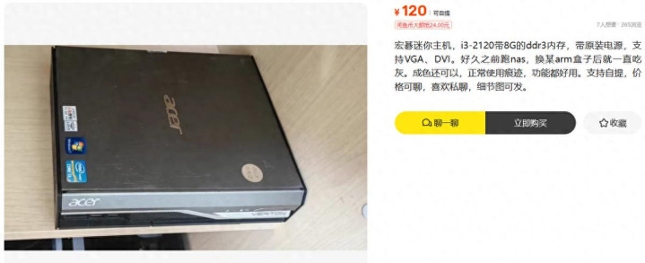 今天刷到一台宏碁迷你主机,i3 2120料理器,8G DDR3内存,带原装电源,相沿VGA和DVI。就这一堆东西,标价120元。虽说这套主机的成就不高,但120元的价钱还真值得一看。