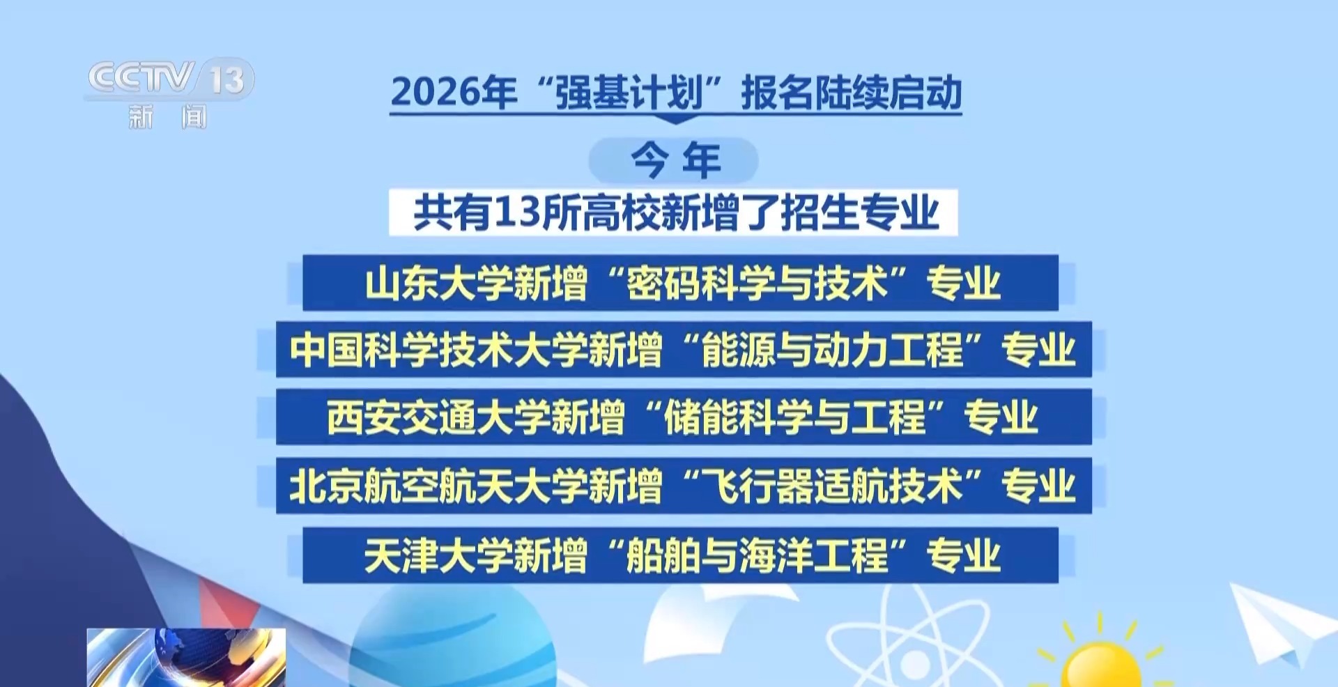 本年,共有13所高校新增了招生专科。其中,山东大学新增“密码科学与技能”专科,中国科学技能大学新增“能源与能源工程”专科,西安交通大学新增“储能科学与工程”专科,北京航空航天大学新增“遨游器适航技能”专科,天津大学新增“船舶与海洋工程”专科。