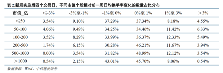 统计新规实施以来,不同市值个股日均换手率相对上一周日均换手率变化的数目占比分散情况,数据显现:市值分别为≤50亿元、50-100亿元、100-200亿元、200-500亿元、500-1000亿元、>1000亿元的股票,新规实施后四个走动日的日均换手率比拟前一周减少稀奇3%的数目占比分别为3.54%、4.06%、3.52%、1.74%、0.00%、0.54%。即:跟着市值的加多,新规实施后的股票换手率相对前一周降幅稀奇3%的数目占比举座呈现下降趋势。
