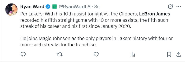 此役詹姆斯完成联结5场比赛10+助攻活命第五次,亦然自2020年1月份后初次,更是与魔术师并排湖东说念主队史仅有两位至少4次联结五场助攻上双的球员。