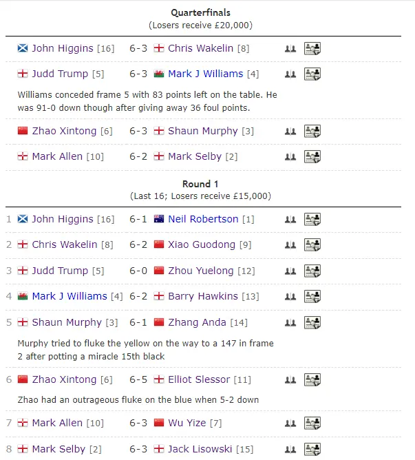 1/4决赛,希金斯又在与新科苏格兰公开赛冠军克里斯-韦克林的比赛中,以6-3投降敌手,强势晋级4强。半决赛,希金斯的敌手是寰宇第一“准度王”贾德-特鲁姆普。