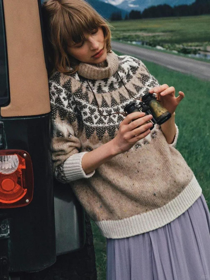 提花毛衣仿佛一首玄机的诗,相配是这件费尔岛毛衣,肩头有那北欧雪原的图腾,仿佛能听到辽远牧羊东说念主的歌声。