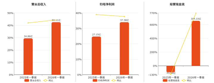 公司贸易总收入为50.31亿元。归母净利润为37.38亿元。预备步履现款净流入为304.33亿元。